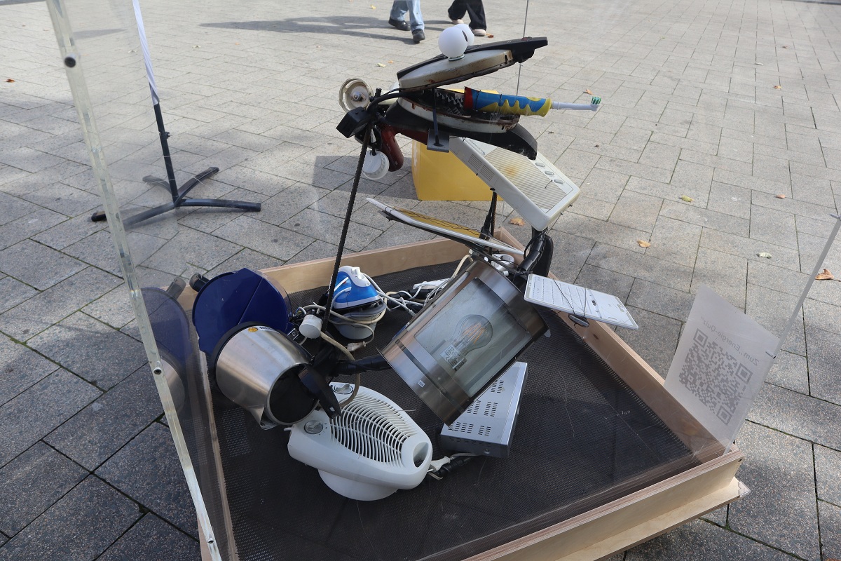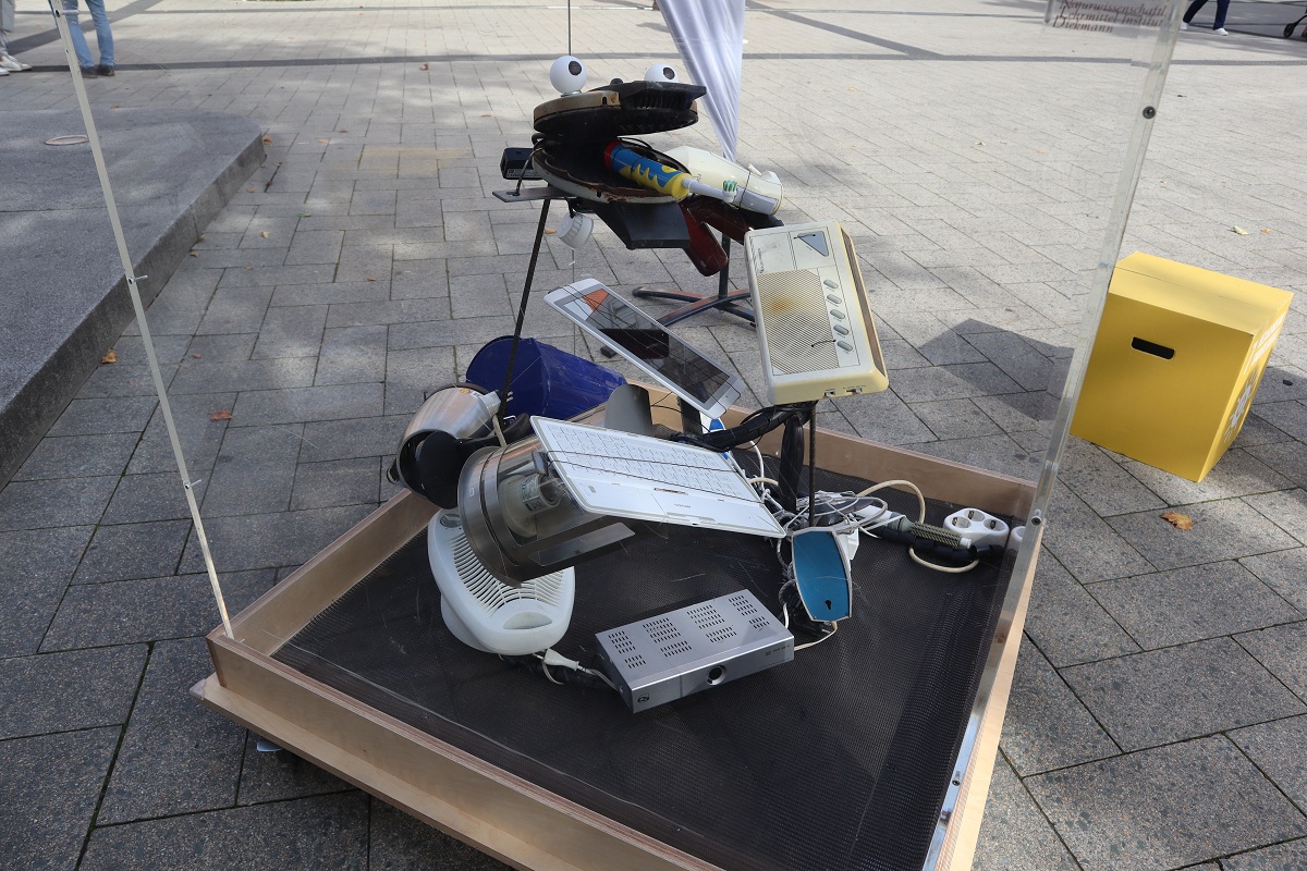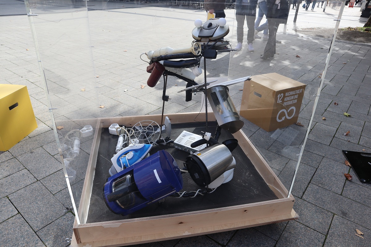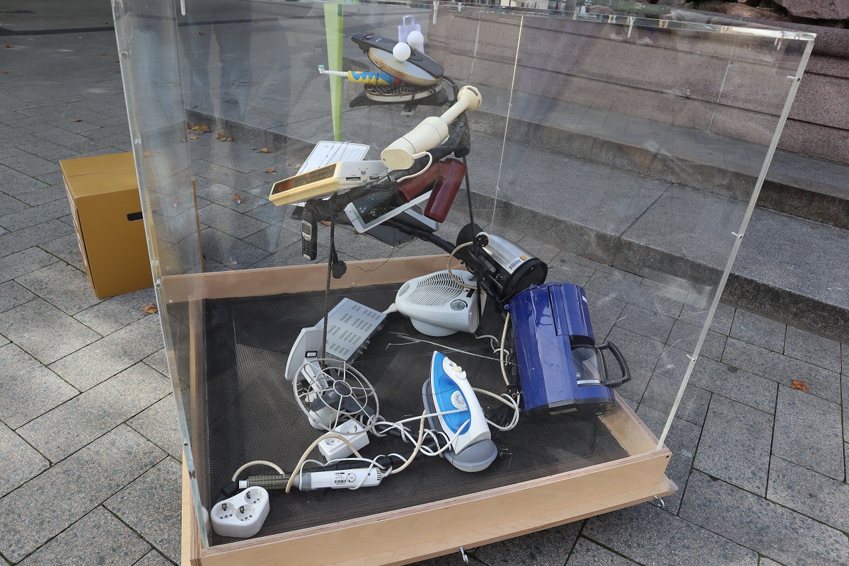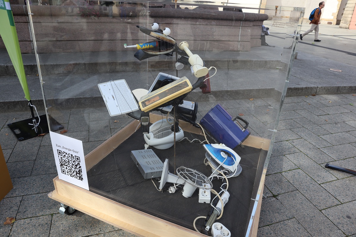 In der Energieschlange sind insgesamt 15 typische Geräte aus dem Haushalt verbaut: Zahnbürste, Waffeleisen, Stabmixer, Rasierer, LED-Einbaulampe, Fön, Radiowecker, Handy, Tablet, LED-Außenlampe, Wasserkocher, Kaffeemaschine, Bügeleisen, Ventilator, TV-Receiver, Heizlüfter und Lockenstab. Haben Sie alle gefunden? Ein Klick auf die Fotos zeigt sie Ihnen im Detail.